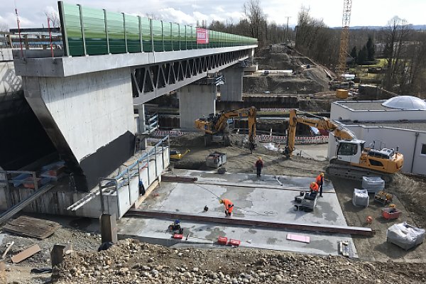 Einspurige EÜ mit Überbau als Verbundfachwerkkonstruktion Gesamtlänge: 120 m. Zur Minimierung der Sperrzeiten Querverschub der Gesamtkonstruktion inkl. Pfeiler und Widerlager um 13 m (ca. 5.220 to).