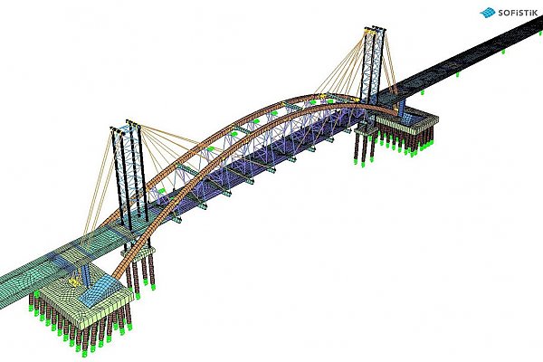 Komplexes Bauverfahren mit Hilfspylonen und Freivorbau des Überbaus, Bogenmontage auf Hilfsgerüst und anschließender Lastumlagerung